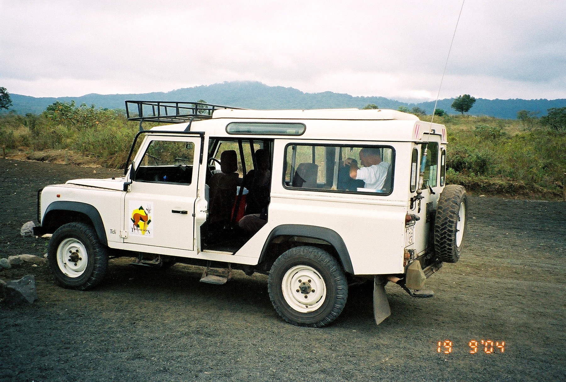 Sunday, September 19 – I awoke at the Mountain Village Lodge after arriving in the late evening. There is a central lodge building with a restaurant and store, and a couple of lines of small cottages built on the surrounding grounds. The rooms were nice and fitted top western standards but the electricity worked only intermittently until Jerry and Mike found an electrical short in their room, next door to mine, and fixed it. Their lights worked, then mine worked, and then the air conditioner worked. We had a buffet breakfast outdoors and received a briefing about our climb, which would begin the next day. (Most trips like this build in a buffer day on the schedule to allow for late arrival of luggage.) Here is a picture of us getting set to climb into two Land Rover Defenders for a day of wildlife viewing in Arusha National Park. For movie buffs and John Wayne fans, this is the park where the 1962 movie “Hatari” was filmed. The park is at an elevation of about 4,500 feet, about the same as the airport; our acclimatization for the climb began when we landed.