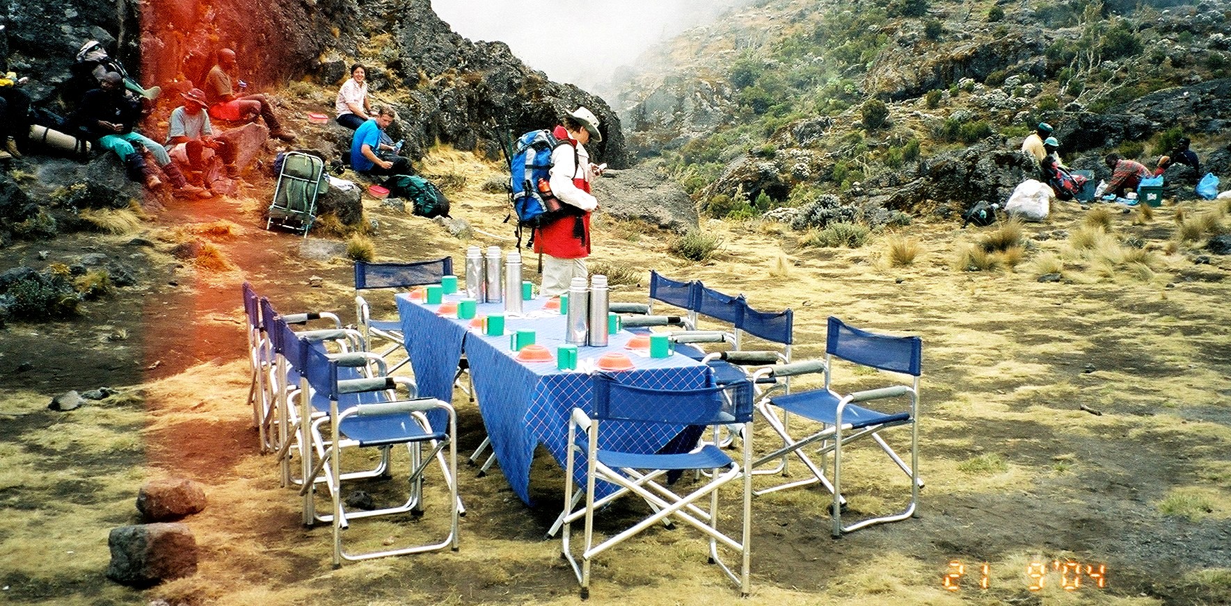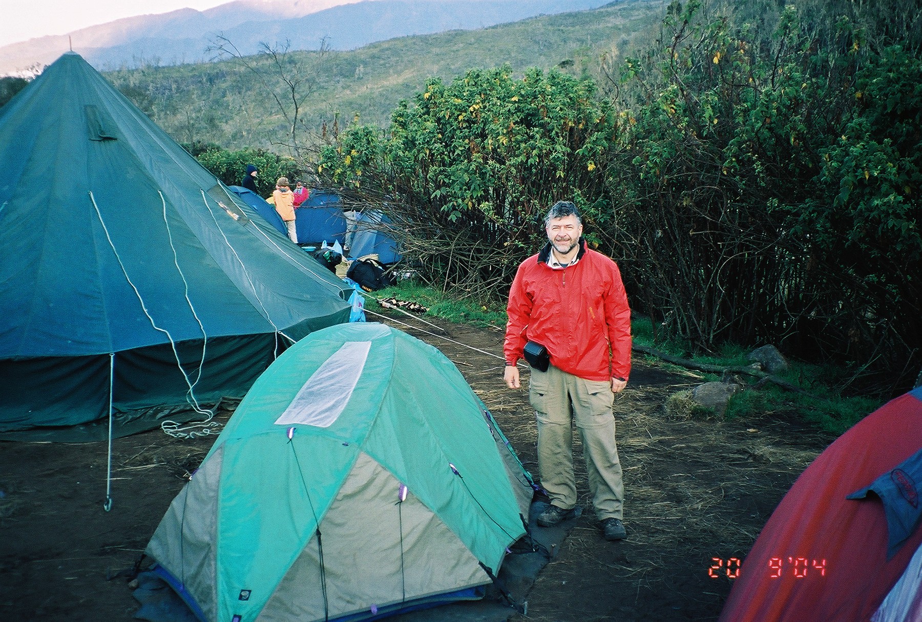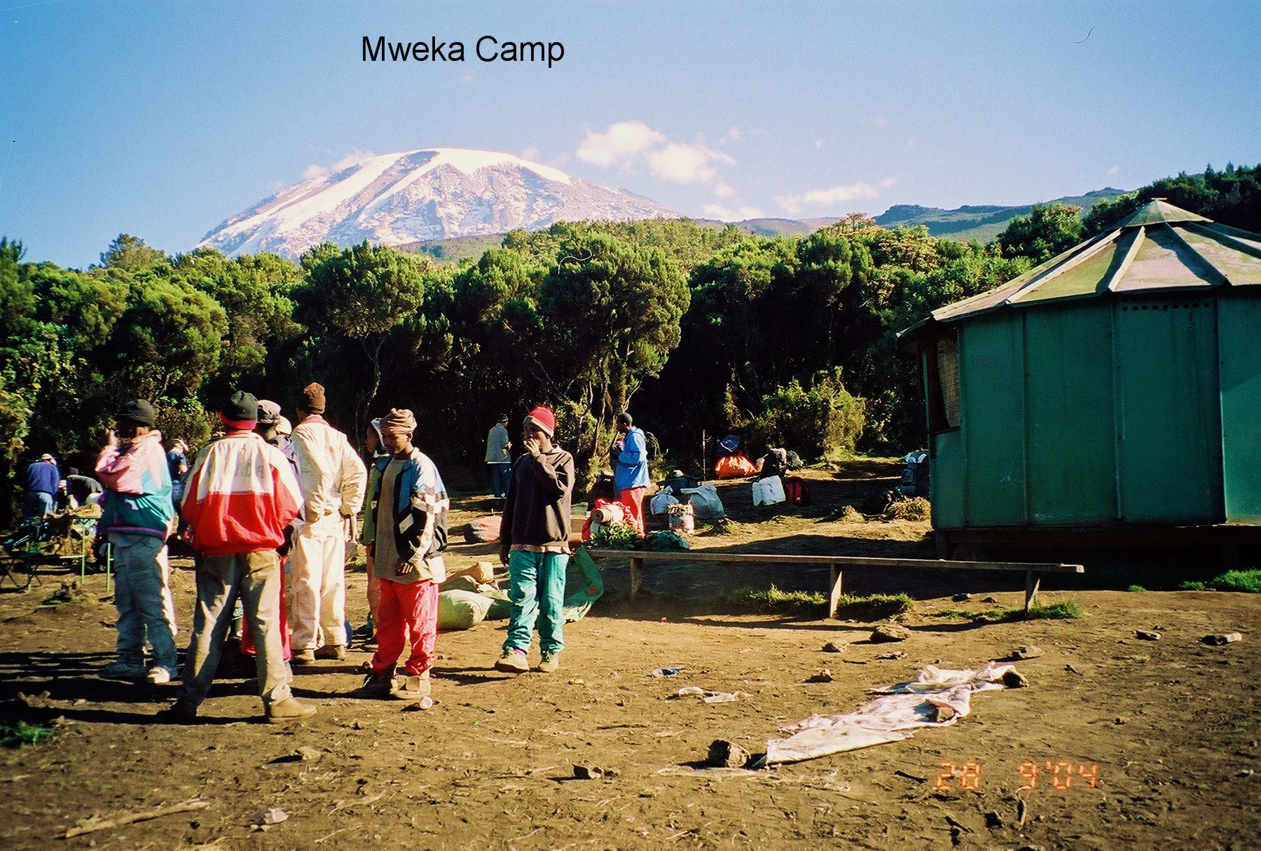 At this camp we had to significantly lighten our gear bags so that our porters would not have to carry more weight than necessary up the escarpment, so a fair amount of time was spent this afternoon packing and repacking our gear. What we left behind would be taken ahead to Mweka camp on an easier route by some of the porters, and we would catch up with it on our way down. I used my evening wash water to again rinse out a couple of my handkerchiefs as my nose was still oozing blood, perhaps due to the low humidity and high altitude.  After supper we spent more time than usual visiting and talking in the dining tent than we usually did at dinner – tomorrow was the big day, we hadn’t been worked to the bone for a change and had some energy left, and for as long as the meal tent stayed warm we talked away into the evening before turning in.