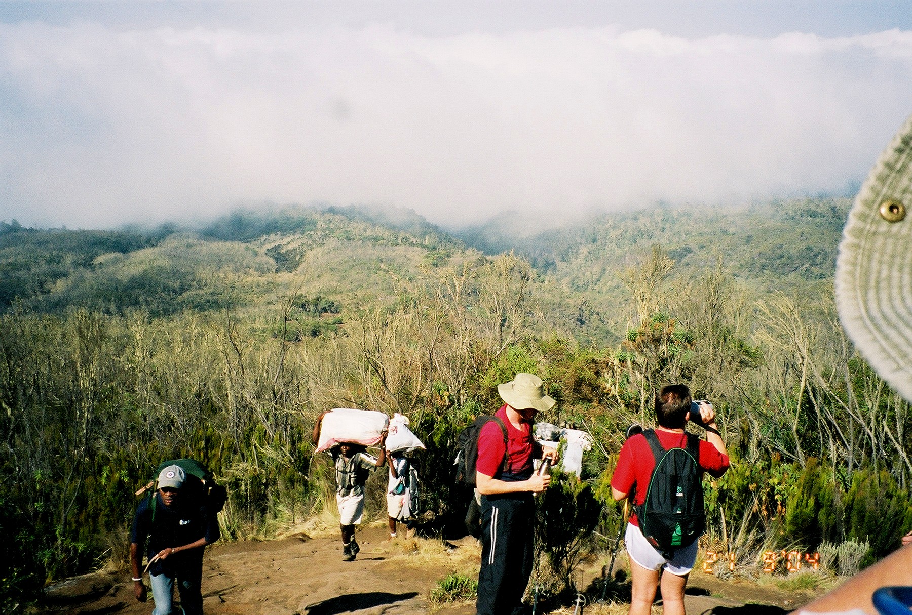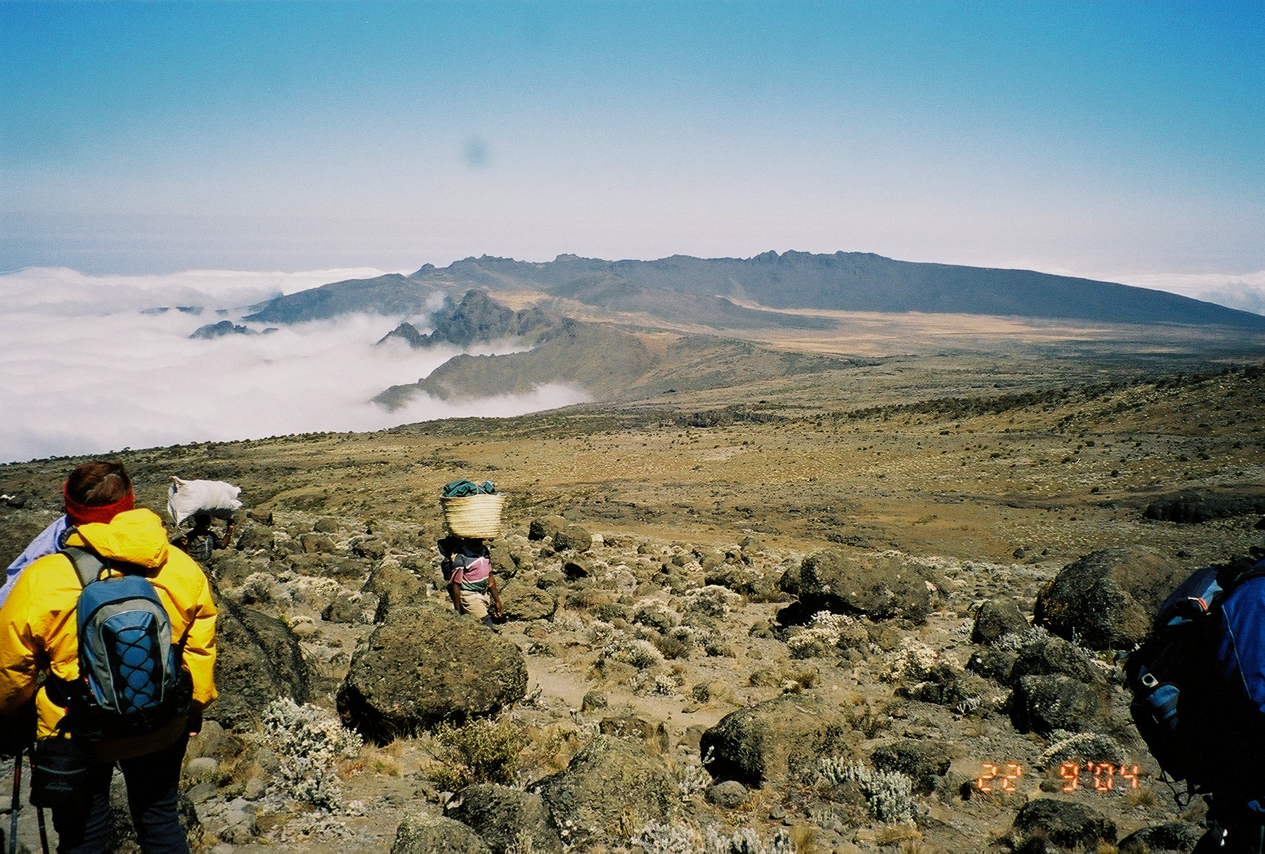 Feeling like this morning was something of an anticlimax, I headed back down the mountain with the group. Our goal for the day (not like a work goal, we really have to do this) was to descend from 19,340′ to 11,000′ by dinner time, and we would have to make good time on the trail to accomplish this. Quite a drop! As we started down I discovered that I had let my water tube freeze (I was using a camel pack rather than water bottles) by forgetting to blow it dry after every drink, so I couldn’t have anything to drink for the next couple of hours until it thawed. Going down was easy at first as we walked the rim to the other side of the crater, where we came to Stella Point. After that we encountered scattered, small scrambles as we moved down, long stretches of “African switchbacks” and then steep slopes of soft gravel where we indulged in slowly running down taking giants’ steps all the way. In an exhilarating half hour or so of doing this we covered a lot of ground quickly, but at the cost of grinding exhaustion in the thighs, like skiing all day on deep powder but without getting into shape first. My legs were shot from this point on.