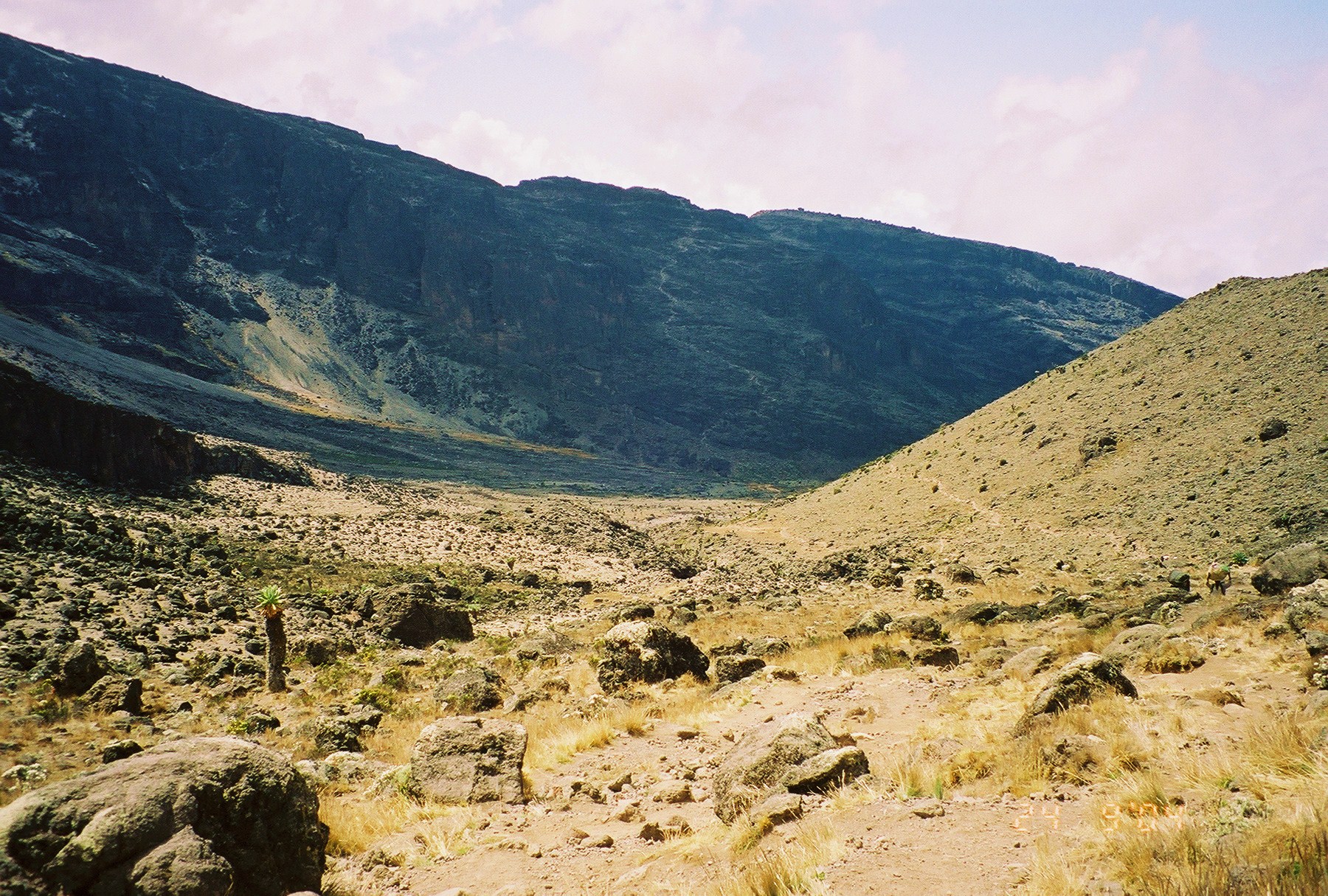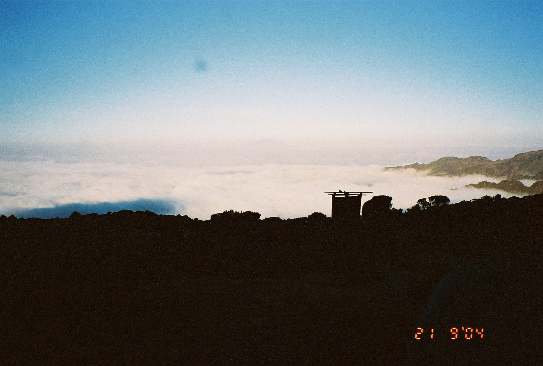 Here are a couple of pictures taken from Shira II camp, which was not located at the same site as in 2002; the park service moves camp sites regularly to avoid permanent damage to the terrain from all the climbers. Kili is obscured by clouds but you can see we have moved completely out of the heather climate zone to the moorland; only very low scrub vegetation and rock was around us here.