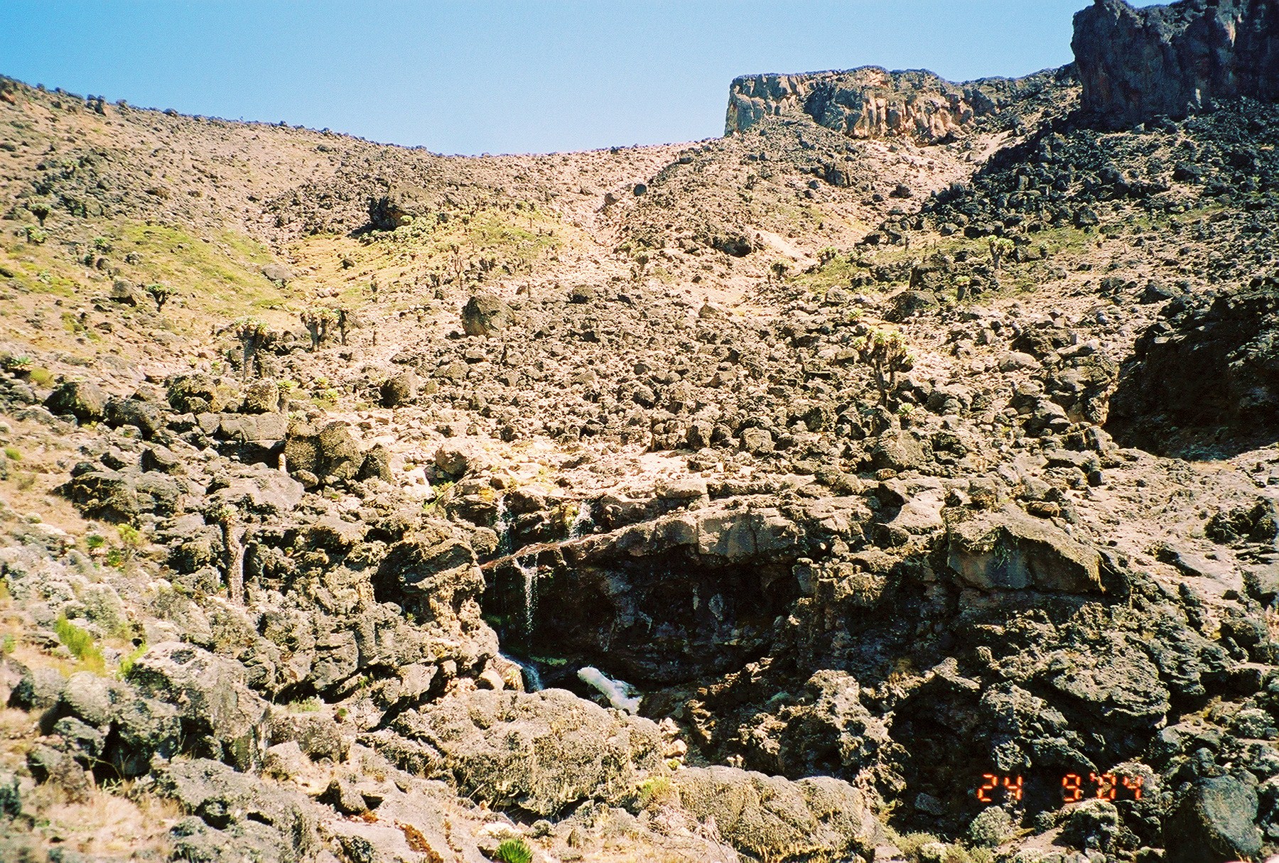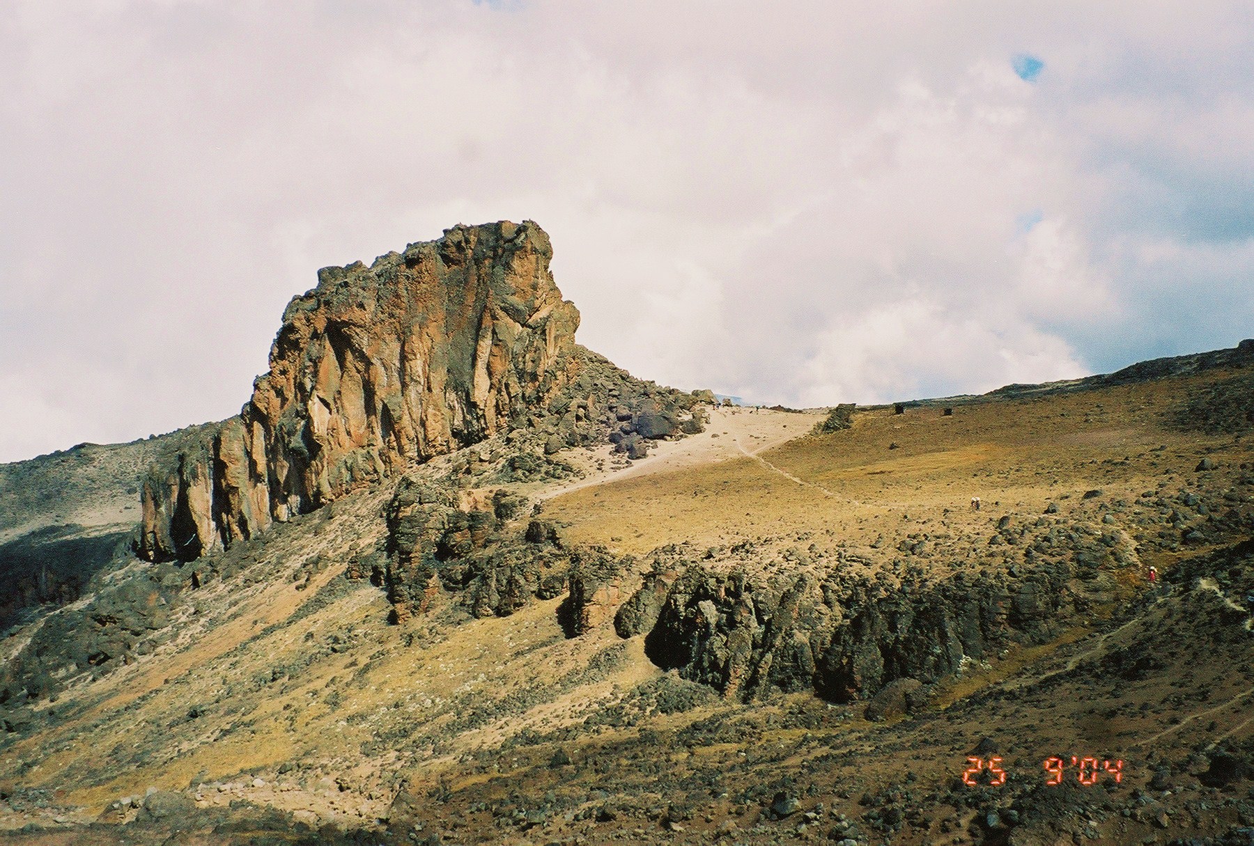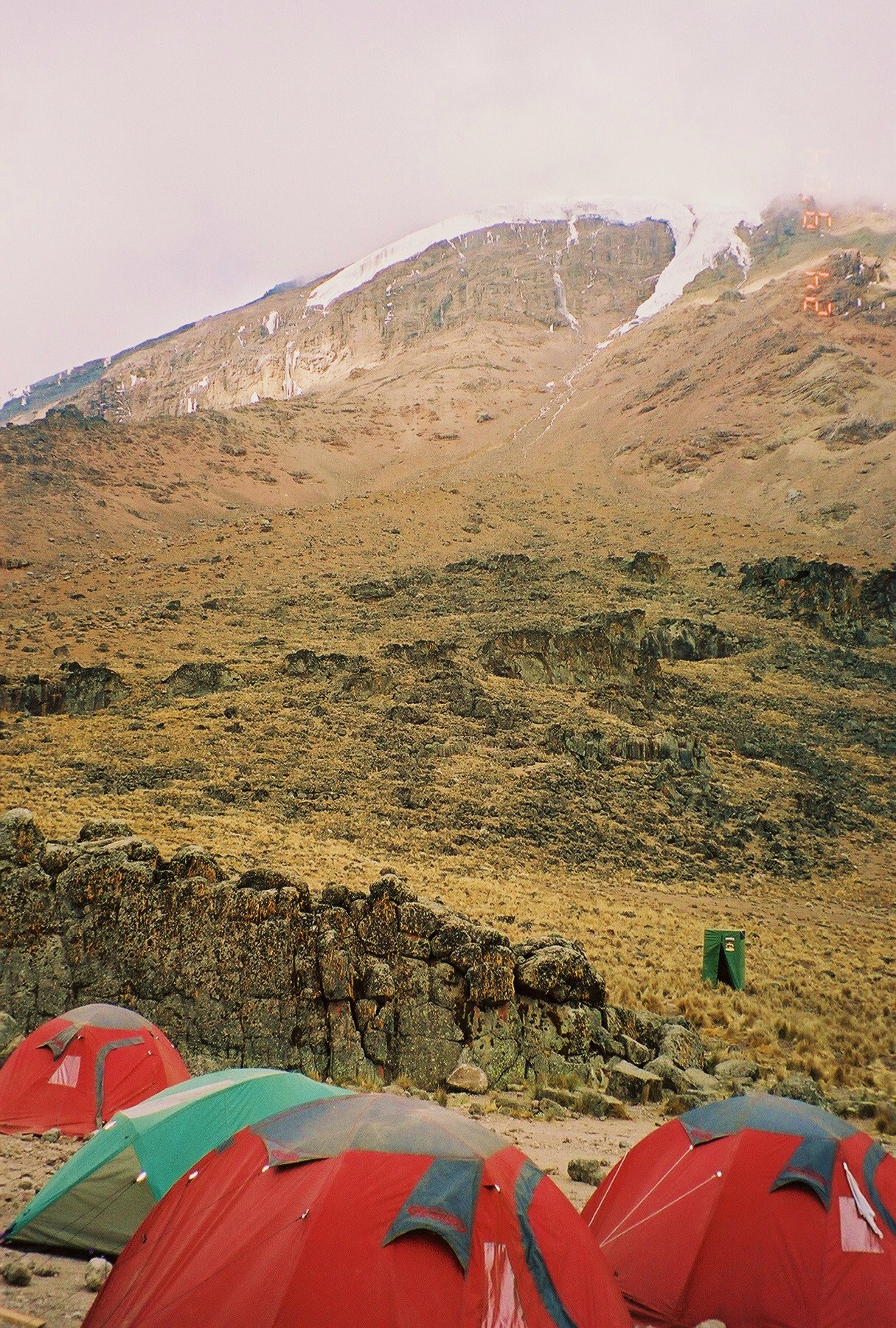 Although the day’s hike was relatively short, it was tiring. We had taken a different route up than the one we took coming down from Lava Tower to Barranco two days before. We made camp here next to this landmark. The campground was much less crowded here, and quieter, as most of the groups around us the night before had ascended the Barranco wall that morning on their way to the summit via the Barafu route.