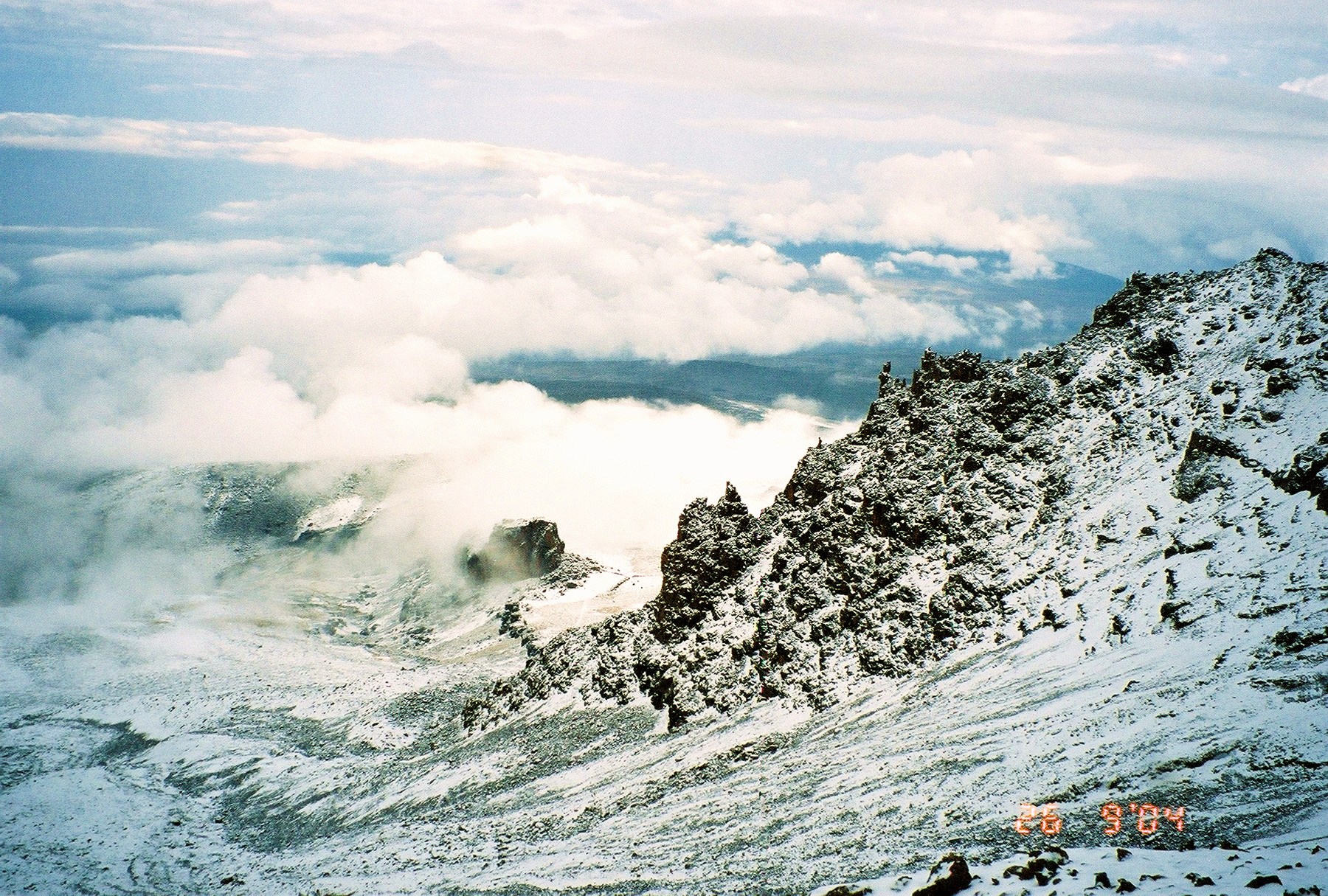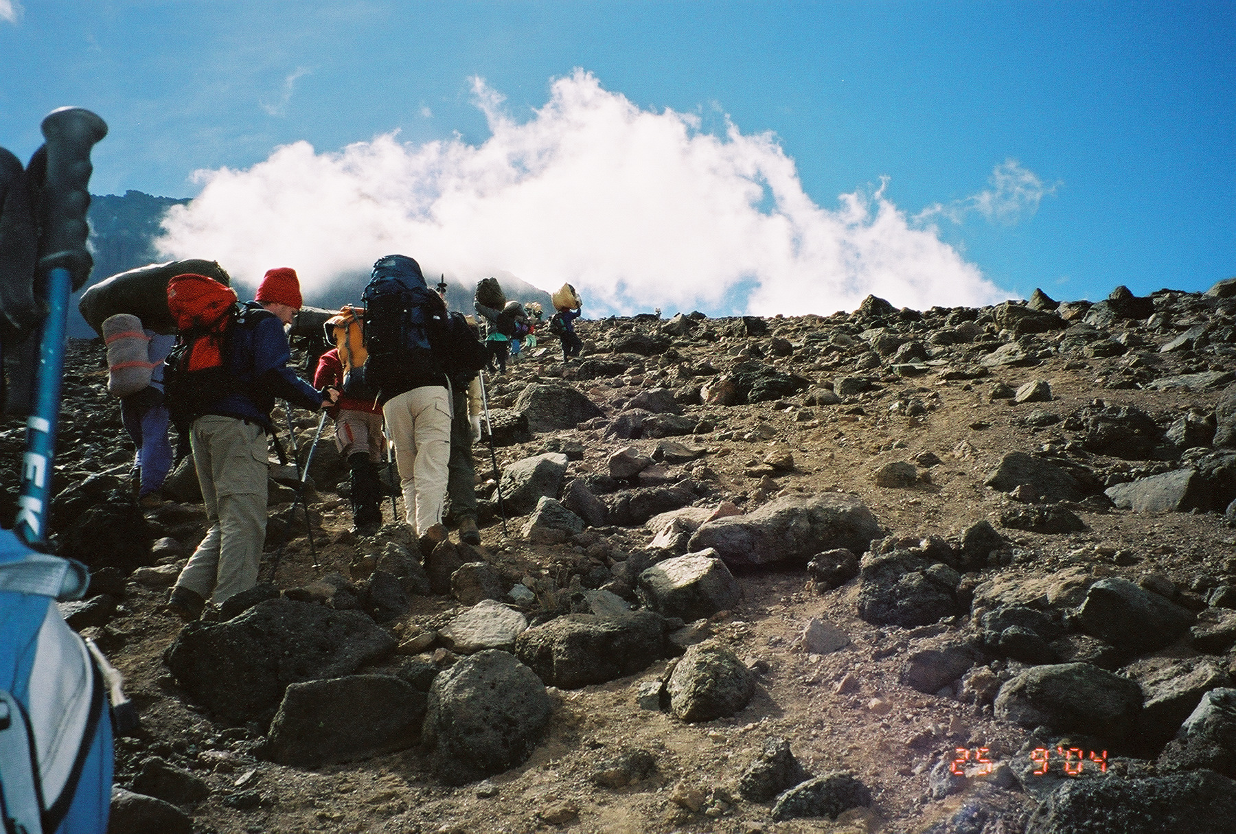 Sunday, September 26 – This was the big day for our assault on the Western Breach and we needed to climb, as I said, from our camp at 16,300′ up to the crater’s rim at 18,750′, and then hike on to our campsite. We hit the slopes at 6:30 a.m. after a fumbling repacking of our sleeping bags, clothes and the gear that was going up with us, and after eating a very early breakfast. We began the climb by ascending a very steep slope, taking a narrow loose gravel trail with “African switchbacks” (short, steep switchbacks), up the gravel ridge prominent in the middle of the Western Breach. We then came onto a series of steep scrambles up the rocky outcroppings. In the picture below you can see what it looked like as we climbed. The large dark rock in the cloud just down and to the left of the center of this picture is Lava Tower, our camp site two days before.