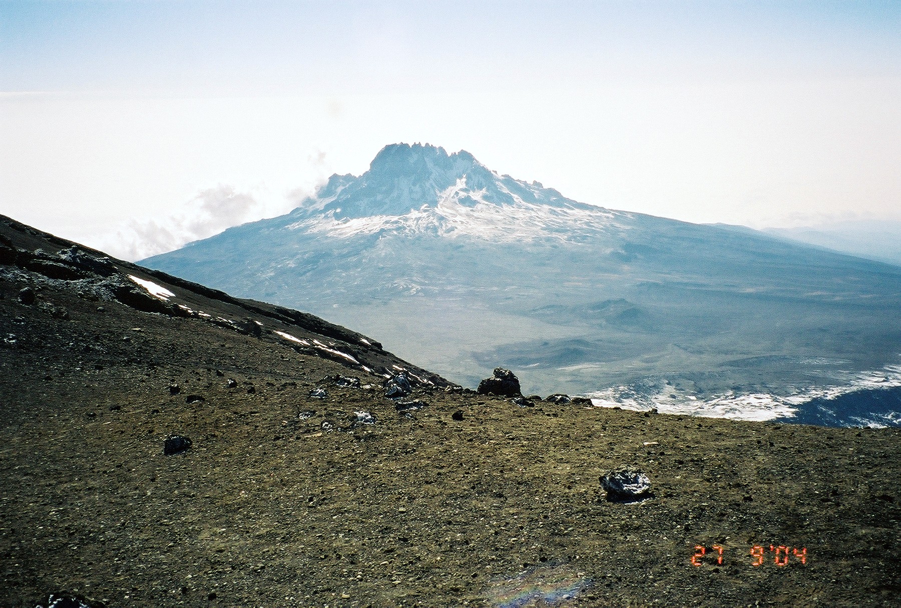 Here is a picture of the third of the ancient volcanic peaks, Kibo, taken on the way down the mountain.